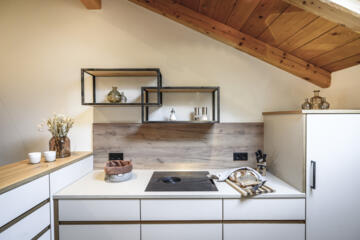 - Küche: Bora-Kochfeld, Kühlschrank, Geschirrspüler, Kaffeemaschine, Wasserkocher, und Toaster