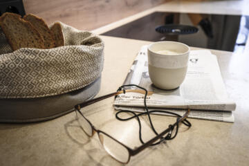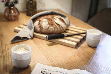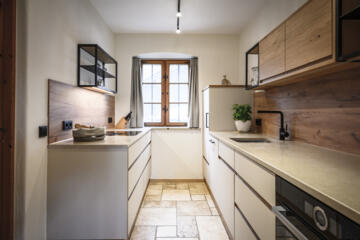 - Küche: Bora-Kochfeld, Kühlschrank, Geschirrspüler, Kaffeemaschine, Wasserkocher und Toaster