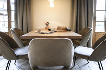 - Wohnraum: Großzügiger Wohnraum mit Holzbalkendecke, stilvoller Essbereich